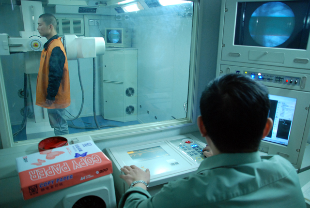解放军三七一医院的医护人员操作野战x光线车上设备为在押人员体检